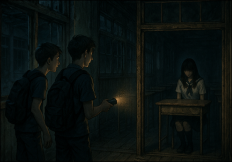 懐中電灯の光に照らされる廊下は、湿気と埃の匂いがこもり、床板がぎしぎしと鳴った。互いに冗談を言い合い、怖さをごまかしながら進むうちに、一つの教室の前で足が止まる。