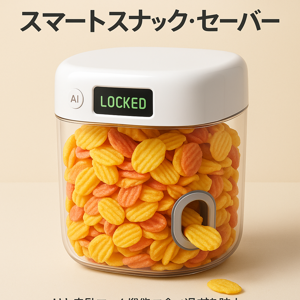 | お菓子が美味しすぎてついつい食べ過ぎてしまう人のために開発された未来型お菓子ケース。AIと自動ロック機能を搭載し、あなたの食べ過ぎを防止します。 時間や摂取カロリーを設定すると、ケースが自動で開... |