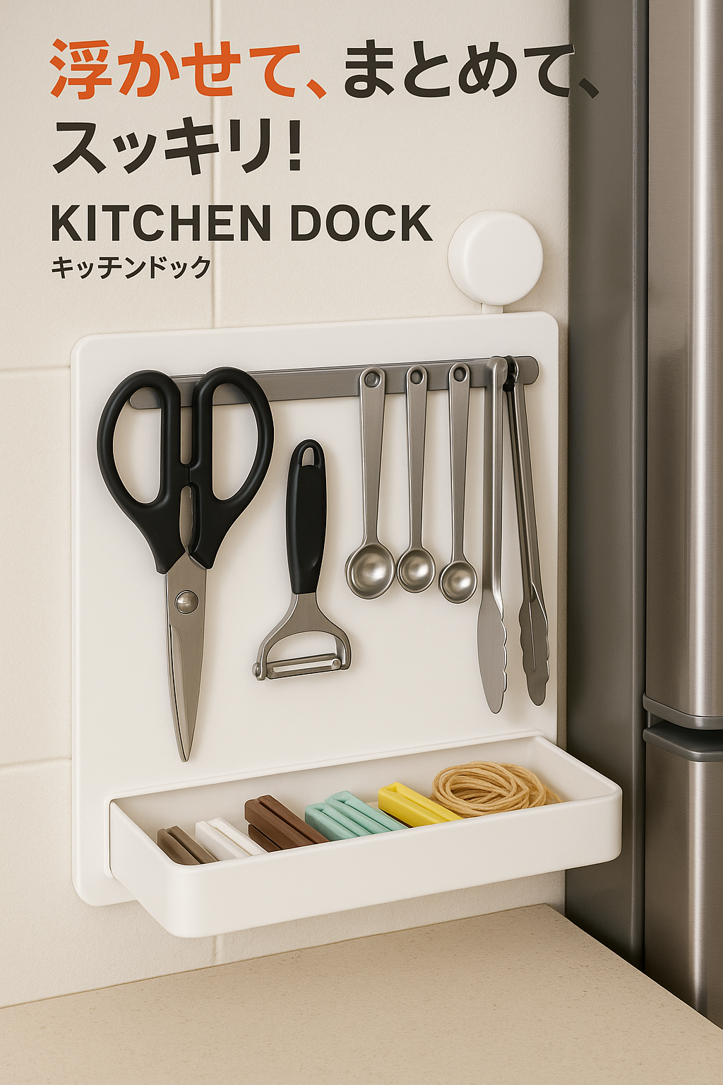 | キッチンドックは、増えすぎたキッチン便利グッズを**“浮かせて収納”**できるスマート収納ステーションです。 壁や冷蔵庫横にマグネット+吸盤で固定し、ハサミ・ピーラー・計量スプーン・トングなど小... |